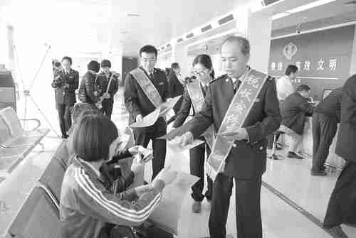 图为税务工作人员向办事群众发放宣传材料 记者曹健强摄
