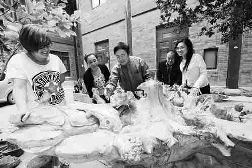 为把这块皂角树根雕琢成精品,崔东友不顾年事已高和初夏的艳阳高照,用了近一个月期间,这件长2.5米,宽2.2米,高1.2米,重约千余斤的《妙吉祥》作品终于问世。 沈志海摄