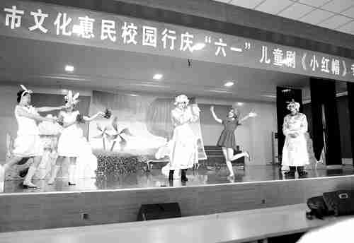 在“六一”儿童节期间,青州市委宣传部、市文化广电新闻出版局和市教育局共同举办“青州市文化惠民校园行”文艺演出活动,以“政府买单、群众看戏”的方式,在海岱小学、师范附小、旗城小学等学校进行“文化惠民校园行”演出,让更多的少年儿童在话剧观赏中愉悦身心,开启智慧,过一个有意义的“六一”儿童节。图为山东话剧院演出话剧《小红帽》。 记者曹健强摄
