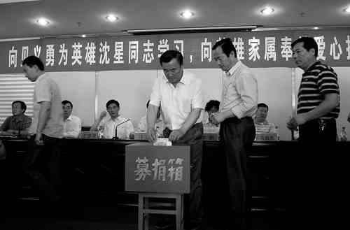 5月13日二炮工程大学士官职业技术教育学院年轻军官沈星在青州为救落水少年英勇牺牲后,广大青州市民纷纷行动起来,开展向英雄亲属捐款活动,用一种力所能及的方式回报英雄的大爱。16日下午,许多行人自发地在青州北联大酒店捐款箱前停车、驻足,既有捐数百元的,也有几十元、几元钱的,无论钱多少,但人们表现出的都是一种真诚、一种崇敬。 记者郭庆滨摄