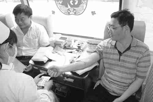7月1日上午,青州市公路局组织党员干部开展献血活动,向党的93周年华诞献礼。填表、信息查询、免费体检、免费验血、静脉采血……按照献血的流程,公路局的党员们用自己的实际行动向社会传递着正能量。 郭金鹏摄