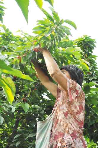 当前正值樱桃成熟时节,弥河镇近千亩露天大樱桃喜获丰收。晶莹剔透的果实挂满了枝头,村民们的喜悦之情溢于言表,大家抓紧时间采摘“幸福果”,忙得不亦乐乎,樱桃林里一派丰收的热闹景象。图为该镇刘家村果农采摘樱桃。 韩东涛 平萍摄