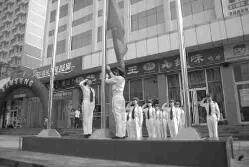 为庆祝27周年店庆,7月18日一大早,青州人民商场在门前广场举行了简朴而庄严的升旗仪式。据商场负责人介绍,作为企业文化的一部分,店庆日早晨举行升旗仪式,不仅激发了全体员工的荣誉感,更展现出全体员工爱岗敬业、团结互助的精神风貌。 记者曹健强摄