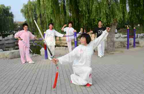近日,几名喜欢武术的市民一大早在青州北城花园交流、切磋太极剑技艺。近年来,青州市不断加大公共健身场地和各类健身设施的投入力度,积极倡导全民健身,大众健身运动形成热潮。 沈志海摄