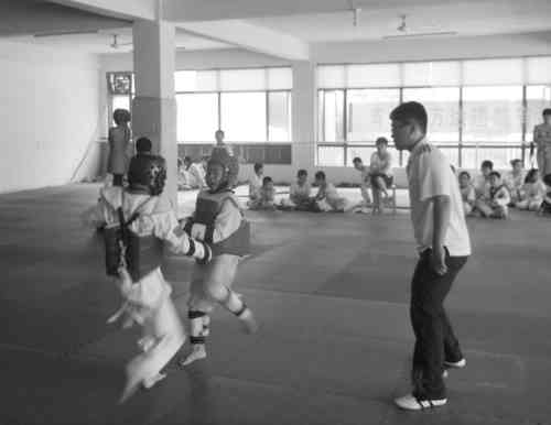5月20日,几名青少年跆拳道学员正在进行用拳、掌或脚分别击碎木板、砖石,双飞击板和横踢击板等跆拳道节目表演。当日,青州市都市精英武道俱乐部举办“万达建筑杯青州市第二届少儿跆拳道精英赛”。青州市跆拳道协会名誉主席李守学同学生家长一起观看了跆拳道武术表演。据该馆负责人刘兆斌介绍,因跆拳道简单易学,其道服、绶带仪式、礼仪等都很有特色,已吸引了不少武术爱好者报名练习,并逐渐形成一项新时尚的健身运动,都市精英武道俱乐部是潍坊市唯一的跆拳道国家级青少年体育俱乐部,除满足学员健身需要外,还将为山东甚至中国跆拳道运动输送更多的优秀苗子。 (记者郭庆滨)