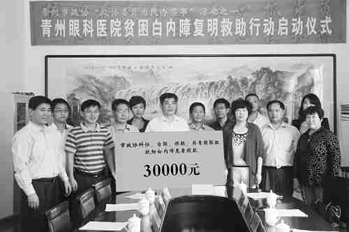 9月24日上午,由青州市政协倡导的“政协委员为民办实事”系列活动之一的贫困白内障患者复明救助行动在市眼科医院启动,市政协科协、台联、侨联、共青团联组的政协委员为本次活动捐助3万元。将为30名特困白内障患者,免费实施复明手术。据悉,开展为贫困白内障患者复明手术活动,是由市政协委员、青州眼科医院院长刘德平与部分政协委员及社会爱心人士发起,几年来,青州贫困白内障患者复明救助行动已经为百余名特困白内障患者解除痛苦,再度享受到阳光的润泽。 胡文彦摄