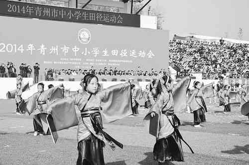10月17日,在全市中小学生秋季田径运动会开幕式上,夏庄小学400名学生表演的古装团体操《礼仪之邦》,还原中国古典传统礼仪,给人耳目一新的感觉。近几年,夏庄小学针对学生大力弘扬中国传统文化,开展传统的孝德、礼仪教育,《弟子规》、《千字文》、古诗词朗读蔚然成风,提升了孩子的尊老敬老素质,取得良好成绩。图为夏庄小学学生在开幕式上表演《礼仪之邦》。 记者刘建丽 通讯员孙忠 孙凤花摄