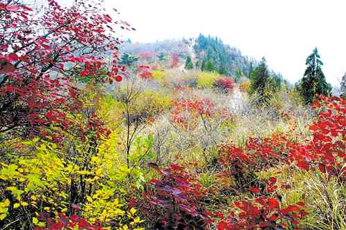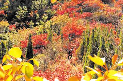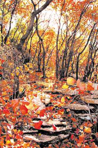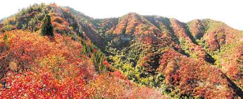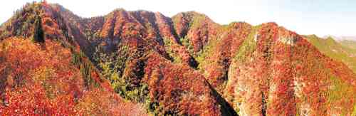 万山红遍,层林尽染,聚仰天山,赏美丽红叶。仰天山的红叶有自己的特点,仰天山树种丰富,红叶林也是如此,天然红叶林以黄栌为主,间杂大果榆、五角枫、栾树、连翘等树种,丰富的树种使的仰天山的红叶林延续时间长,从10月中旬一直持续到11月底;颜色深浅不一,有的是艳红,红的似火;有的是淡红,红的如霞;仰天山特殊的地形生成了独特的红叶景观,与北京香山红叶相比,一样的红叶却有不一样的感觉,有一种“疑似仙境非人间,醉话丛中不思返”的境界。 (郭庆滨)