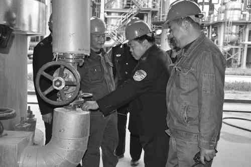 为防范安全事故发生,连日来,经济开发区组织多支检查队伍,聘请安全生产专家,对八个片区的企业展开了地毯式隐患排查,并“一企一策”帮助科学制定整改方案。对安全隐患不能按时整改到位的企业,坚决停产整顿,确保辖区安全生产形势持续稳定。图为安监人员在天安化工生产一线检查。 田玉明摄