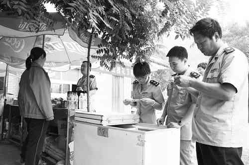 盛夏来临,冷饮市场进入销售旺季。为确保夏季冷饮市场消费安全,近日,青州市工商局在辖区内集中开展了冷饮市场专项检查行动。此次检查以学校周边区域为重点,突出检查路边摊贩和流动商贩,检查其是否具备经营资格、进货渠道是否正规,有无经营“三假”(假商标、假包装、假标识)冷饮等情况。图为王坟工商所执法人员正在检查一冷饮零售点。 时坤强 沈彦艳摄