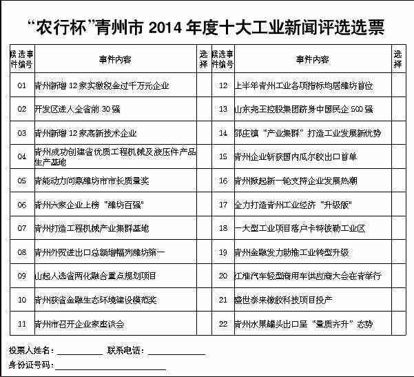 为了梳理过去一年发生在青州的重大工业新闻事件,《潍坊日报·今日青州》与农行青州支行联合开展2014年度“青州十大工业新闻”评选活动,对2014年的工业发展进行一次历史的总结和回顾,为“重点突破工业”营造良好的舆论氛围。现将本报资深媒体人士和有关专家初选出的22件候选工业新闻事件条目公布如下,供广大市民讨论投票。评选方法将通过专家与群众投票相结合的方式进行,最终评选出2014年青州十大工业新闻事件。