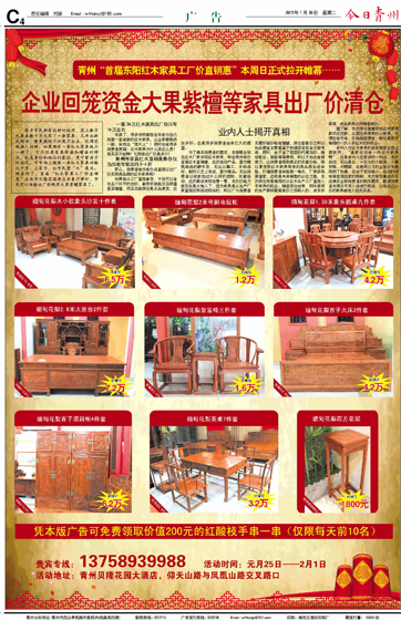 为了满足消费者的需求,本报联合知名红木厂家东阳红木家具,特在我市举办首届红木直销惠,此次活动产品,皆为精挑细选的硬手货,无论从雕工、木料选材、制作工艺上来说,皆为精品。无论消费者以前参加过什么样的团购、优惠活动,这次都该来现场看一看,本次价格力度实在是太惊人了,因为家具是从生产厂家直接拉到活动现场的,所以广大消费者无需怀疑价格有猫腻,清仓套餐价之所以如此便宜主要是基于快速回笼资金方面考虑,同时,由于省了层层的代理加价、商场柜台、装修等等费用,所以才如此有诱惑力,让消费者得到真正的实惠价格,得以享受到红木家具带来的高品质生活体验,打通消费者体验第一难关,厂家获得美誉度,这将是未来销售的必经之路,本次清仓将是难得的从红木生产工厂直接入手家具的机会,随着清仓结束,明年使用的生产原料都是涨价之后购入的,成本非常高,成品家具必然随着涨价。