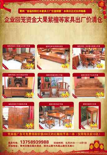为了满足消费者的需求,本报联合知名红木厂家东阳红木家具,特在我市举办首届红木直销惠,此次活动产品,皆为精挑细选的硬手货,无论从雕工、木料选材、制作工艺上来说,皆为精品。无论消费者以前参加过什么样的团购、优惠活动,这次都该来现场看一看,本次价格力度实在是太惊人了,因为家具是从生产厂家直接拉到活动现场的,所以广大消费者无需怀疑价格有猫腻,清仓套餐价之所以如此便宜主要是基于快速回笼资金方面考虑,同时,由于省了层层的代理加价、商场柜台、装修等等费用,所以才如此有诱惑力,让消费者得到真正的实惠价格,得以享受到红木家具带来的高品质生活体验,打通消费者体验第一难关,厂家获得美誉度,这将是未来销售的必经之路,本次清仓将是难得的从红木生产工厂直接入手家具的机会,随着清仓结束,明年使用的生产原料都是涨价之后购入的,成本非常高,成品家具必然随着涨价。