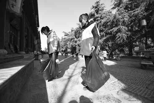 3月1日,青州古街上游人如梭,李洋和吴文超两个小姑娘身着志愿者服装,边走边捡垃圾。据悉,自2月28日起,青州市志愿者协会组织志愿者们走上古街,将游人随意丢弃的垃圾全部捡入塑料袋中,并对一些游客的不文明行为进行善意劝说,倡导游客爱护环境、文明旅游。活动将持续到3月5日。 记者曹健强摄