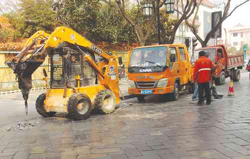 青州市住房和城乡建设局在抓好全市道路新建工作的同时,不断加大对城区原有道路的改造、养护力度。近期,养护人员集中对范公亭路、海岱路、牡丹路、将军山路等分别进行条石更换、雨水篦子清淤、道路挖补等整修工作,方便市民出行的同时,将进一步提升城市品位,完善城市功能。图为养护人员在范公亭路工作。 沙杰摄