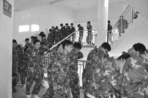 哨音响后,学生迅速起床,在15分钟内完成洗漱、内务整理。被子要叠成“豆腐块”,物品摆放井然有序,室内做到卫生清洁,从中体验部队严格有序的生活。