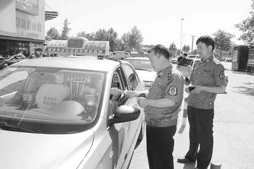 为优化城市发展环境,提升文明城市形象,近日,青州市交通运输局在全市客运出租行业中开展以“强化监督管理,文明守法经营,提升服务水平”为主题的实践活动。图为执法人员在检查出租车相关证件。 刘国磊摄