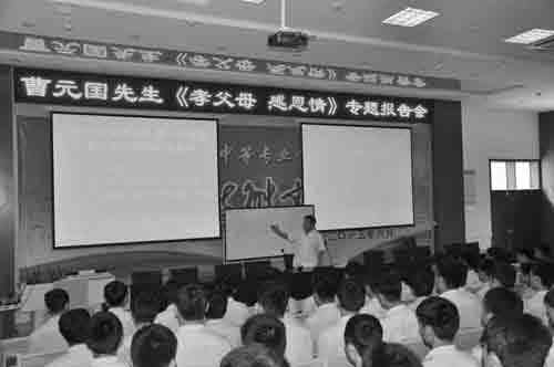 山东民族中专注重加强孝德教育,通过宣传新二十四孝故事、讲授真实案例、邀请专家作报告、动员学生献孝心等形式,引导学生从点滴做起,讲道德、讲孝心,感恩父母、感恩师长、感恩社会,争做有志青年,取得良好效果。图为青州市孝文化研究会会长曹元国应邀为全体师生做“孝父母,感恩情”的专题报告。 范永梅 张洪喜摄