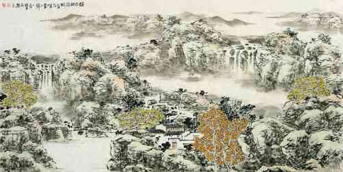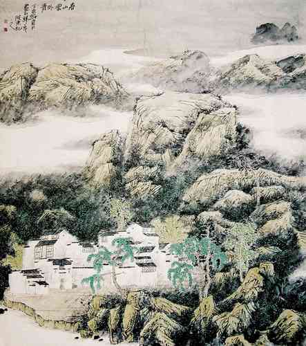这里说的“现代”,并不是指“前卫”,而是“笔墨当随时代”的当代性。传统山水画的空间处理,基本是“三远”的模式,千百年来,都未能离开这种格局。在当代,绝大部分山水画作品的空间处理方式,仍然囿于这种固有的图式,因而总给人千人一面的感觉。而晓东作品的空间处理,采取具有当代平面审美趣味的二维空间方式。既无“自山下而仰山颠”之高远,也无“自山前而窥山后”之深远,“自近山而望远山”之平远。在画面中以房屋为中心向四面拓展,以白云分割画面,从而形成一个具有平面性的二维空间图式。这种处理方式,更具现代人的审美取向,给人全新的感受。石涛云:“古者识之具也。化者识其具而弗为也。”传统往往具有时代的局限,“化者”则不照搬传统而有所发展创新。“故君子惟借古以开今也”,这是我们对待传统的态度。