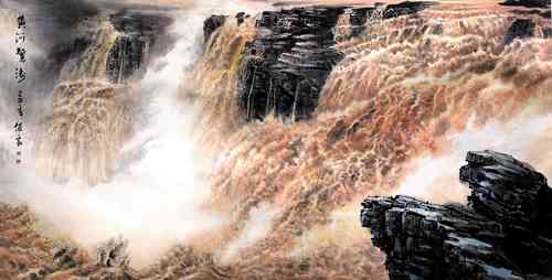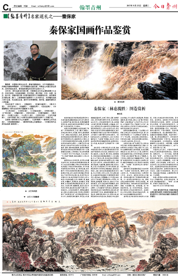 秦保家是河南省很有成就的山水画家,河南山水画近些年来成长很快,贤才辈出,各有特色,我想到以中州大地如此丰厚的历史文化积淀,有黄河、太行这样的山水资源,有飞跃成长的经济实力,文化艺术上的迅速发展的大好形势是绝对必然的。秦保家能够潜心艺术,亲近自然,胸中丘壑罗列,下笔从容挥写,长卷中很多画面精彩生动,我注意到他精于画水,溪瀑流泉的描绘相当精熟,长卷中部作一大瀑,随山势层层倾跌而下,苏东坡诗句“倒倾蛟室泻琼瑰”可用于此,据说此处有亚洲最高瀑布,大约所画即此。他观察描绘得十分生动真实,水雾升腾,如闻轰鸣。主流之外还有旁枝细流汇入,流下山去。画家手段十分了得。