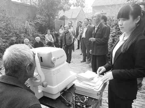 在九九老人节到来之际,青州市东亚眼镜行的员工来到黄楼街道东沙营村,为全村70岁以上老年人免费验配眼镜。一上午时间,共化验90人次,发放老花镜43副,根据化验结果因人配镜30副。图为工作人员正在为老人验光。 夏冰 刘铠铭摄