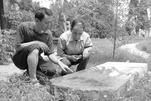 7月11日,青州市教师赵世宁(左一),把珍藏多年的一块清乾隆十九年重修真君庙石碑,捐献给青州市古城保护修复建设指挥部。几年前,赵世宁在北关社区一拆迁户家中发现高190厘米,宽70厘米的重修真君庙石碑,经过协商他把石碑买了下来。当得知古城保护修复建设指挥部收集失落在市民手中的文物时他立即捐献了出来。 记者曹健强摄