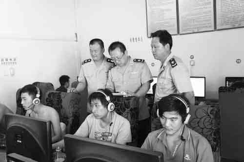暑假期间,青州市工商局集中开展网吧专项整治行动,严厉打击各类黑网吧经营行为,对名义上是信息服务中心、电脑培训部,实质上却在超范围经营互联网接入服务的商家进行重点检查。严厉打击黑网吧经营者,促进网络经营正规有序发展。图为该局执法人员正在一网吧内进行巡查。 沈彦艳 时坤强摄