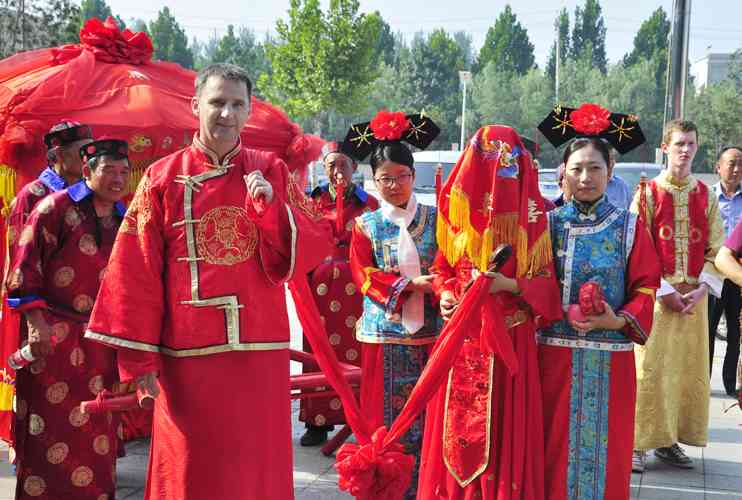 7月28日上午,在海岱南路,一队吹吹打打的传统中式婚礼迎亲队伍吸引了众多过路人的目光,尤其令人惊奇的是,骑在高头大马上的新郎不是中国人,而是一位“老外”。来自德国的顾思哲身着中国传统古典婚庆服装,骑着高头大马迎娶青州姑娘卢慧,而新娘则坐着中国的老式花轿由八个人抬着出嫁。据了解,用中国传统习俗迎娶新娘是女方家提出的建议,他们想顺便让德国女婿了解一下中国的传统文化。迎亲仪式结束后,两位新人还将赴德国举行西式婚礼。 曾宪升摄