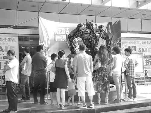近日,美国大片《变形金刚》中“擎天柱”的模型在青州中百大厦门前展示,吸引了众多暑期中的学生和市民近距离观赏、拍照留念,成为古城人们又一个休闲、娱乐的好去处。 李玮摄