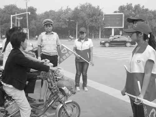 为进一步加强市区道路管理,提升广大市民的文明交通意识,营造自觉遵守交通法规的氛围,市文明办、市交警大队和市志愿者协会组织100多名志愿者早早来到路口,挥舞手中的小旗,按照红绿灯的指示信号指挥非机动车通行。对有些试图闯红灯、乱穿马路等不守法现象,交通志愿者及时予以制止,并利用等红灯的间隙向违法人员宣传有关交通法规,协助交警指挥交通,维持秩序。