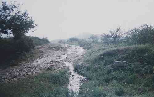 我循小溪登上河岸,岸边有沙石路通往南山,溪水从路上跌宕而来。抬目远望,溪水忽隐忽现,明灭蜿蜒。有的溪段在太阳的映照下闪闪发亮,有的则隐于低凹处,不见了踪影。溪流似乎为人设计下了一个个问号,引发人们去寻求答案;又恍若是为人昭示着方向,导引着人们去探索和追求。