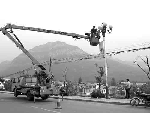 为提升小城镇建设管理水平,让镇区更加美观亮丽,近期,王坟镇组织人力、机械对镇区及主干道路两侧路灯进行检修维护。图为工作人员在镇区文化活动广场修理路灯。 崔广杰摄