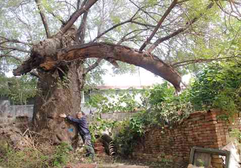 参拜完关帝爷,村民王大嫂说:“村中还有一颗古槐呢,当年进士还曾经在下面乘凉呢。我领你们去。”于是,我们见到了那棵又粗又高的古槐。古槐主枝又长又粗,宛如一条巨龙,伸向正南,翱翔苍穹,热情地迎接着我们。古槐中空,下部有一个大洞,黑黝黝的,像蕴藏着无穷奥秘。古槐苍翠,枝叶繁茂,印证着“洪洞老鸹窝,山东无死槐”的传说。
