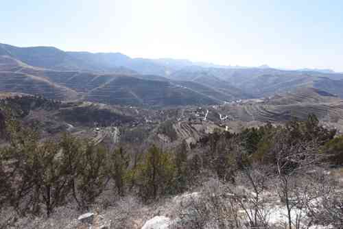 窦家崖村后大山就是宝泉寨,宝泉寺遗址在宝泉寨主峰西北角一崖下,地处非常幽僻,现有一片杨树林。树林看似不远,但需要翻越一条深沟,好在有荒芜的小道可通。这一带沟沟坎坎的山地都是窦家崖村的,过去村民们来这里春种秋收,每年来来回回不知多少次,就走这磕磕绊绊的羊肠小道。须知,他们种地,多数情况下是肩挑土杂肥或者庄稼而上下来回呀。小道因山势和裸露的石头而左右盘旋,齐腰高的山草加上乱蓬蓬的灌木阻碍着我们前进。丁老师特作向导,带着斧头,披荆斩棘而行。尽管路难行,但我时时被眼前美景所吸引。为啥这么冷的时候山沟里还有一丛丛绿色植物?为啥有的连翘枝头还开着娇嫩的黄花?其秘令人难解。