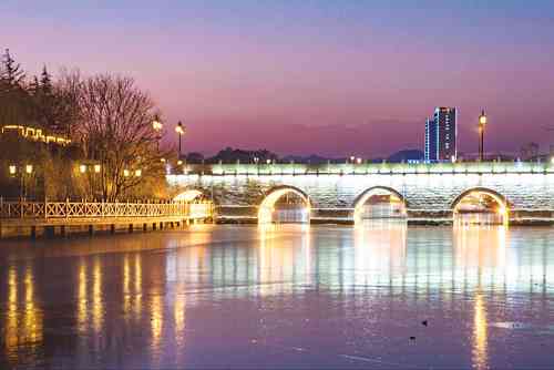 河里的水也已经沉睡了。五彩缤纷的灯光映在冰面上,没有了往日清晰的模样,像一个光怪陆离的梦。不知梦到的是春天的一树芳华,还是夏日的汹涌澎湃,或是迷人的盈盈秋水?