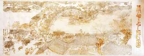 宋朝张择端的“清明上河图”,是中华丹青宝库中的极品。这幅画,宽二十五点二厘米,长五百二十八点七厘米,图中描绘了八百一十五个神彩各异的人物、各种牲畜六十多匹、木船二十多只、房屋楼阁三十多栋、推车乘轿二十多件,生动记录了中国十二世纪北宋都城东京(今河南开封)的城市面貌和社会各阶层人民的生活状况。如此丰富多彩的内容,是任何画作难以比拟的。历代画师争相临摹,然而,能出其右者,甚寡。