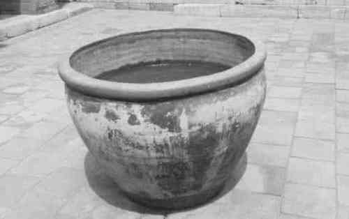 大瓮:水挑来了,总的有地方储存吧,于是粗瓷大瓮就派上用场了。大瓮是家庭必备的储水具。囤里粮不断,大瓮水不干,居家过日子,都是勤快人。大瓮敞口大肚子,容积有大也有小。挑回家就倒在大瓮里。一般家庭常备叫六筲子瓮,盛水三担即六筲,每筲不过四五十斤,多少个瓮能盛一方水?没人计算过。担杖、筲和瓮,这是家庭取水储水三大件。备齐这三大件的人家,家庭条件已经很不错。不少家庭也是缺这无那,好在是街谊邻里好相处,你有担杖他有筲,相互调剂就可以。不过,也有人即使穷得叮当响,却是甘心孤独拒交往,于是绳栓瓦盆上井去挑水。挑到家就无须用大瓮,就势放到地下,三块砖支锅灶,随取随用就可以。凭着力气去挑水,这样的生活方式远去了,想象很艰苦很劳累,不过一分为二也有好处,水是用力气挑来的,所以就得讲节约,一瓢一瓢算计着,没人同自己的力气过不去。