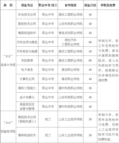 2、毕业生可通过“3+2”连读大专班、“3+3”预备技师班或春季高考升入高等院校继续学习。“3+2”连读指应届初中毕业生须参加潍坊市初中学业水平考试,由所在初中负责填报志愿,经潍坊市招办录取后,注册秋季学籍,在我校学习三年后,参加中职高职衔接转段进入高等院校完成两年大专学习,颁发大专文凭;未被潍坊市招办录取的同学,转入相同或相近的职业中专专业学习。“3+3”预备技师班指注册技工学籍,前两年在我校学习,第三年由我校与山东工业技师学院联合培养,在山东工业技师学院进行理论和技能提升,颁发技工学校毕业证书,后三年由山东工业技师学院培养,颁发预备技师毕业证书。