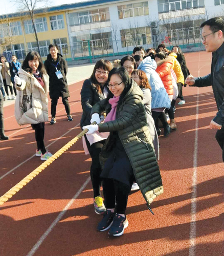 3月8日下午,黄楼学校全校师生利用课外活动的时间聚集操场,各级部处室、初中部和小学女老师之间展开了拔河比赛。