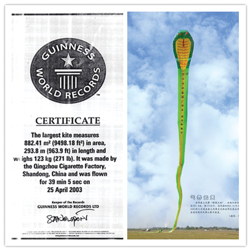 青州是风筝的发祥地,青州人与风筝有着不解之缘。潍坊风筝的三项吉尼斯纪录有两项是青州所创造。2003年青州风筝艺人杨云胜扎制的“眼镜王蛇”风筝,获得了吉尼斯世界纪录最大风筝称号。这只“眼镜王蛇”软体风筝,长293.8米,面积882.41平方米,重为123公斤。经过专家实地考察、验收,吉尼斯总部正式批准该风筝为世界最大风筝。2006年,风筝艺人马庆华一人放飞43只风筝,创造了一次放飞风筝数量最多的世界纪录。项目参赛标准要求是:一人放飞风筝;风筝距手3米以外;单线牵拉一个风筝;放起的风筝必须在天空飘舞30秒以上。同时具备这些条件才能计算数量。经世界吉尼斯中国地区总代理认证官现场认证,马庆华成功放飞43只风筝,成为当今世界一次放飞风筝最多的人,创造了吉尼斯世界纪录。
