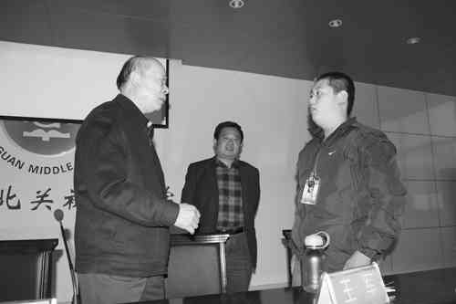 近日,潍坊市“科学家进校园”报告团专家傅前哨空军军事专家来到青州北关初中,为师生做了《航空母舰的秘密》科普报告会。满足了学生对现代科学技术的了解欲望,唤起学生热爱科学、崇尚科学的热情。报告结束后,一名初一学生带着问题跑上讲台,傅教授耐心细致进行了讲解。 俊超 春玲摄
