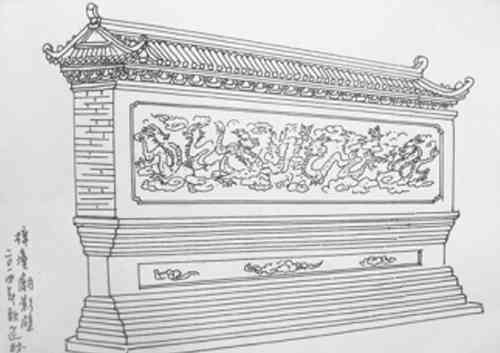 一提起梓潼庙,青州的老人自然想到该庙山门前的大影壁墙。在青州,有“梓潼庙的影壁、法庆寺的山墙、天齐庙的戏楼”之说。这三处建筑,为青州市古建史上的“三绝”。提及“三绝”,青州人便眉飞色舞,翘指不绝。该影壁建于山门之外,去西门小径北侧的高台之上,东西长约10余米,高5米左右,厚80厘米,青砖结构,风格为束腰透雕型,壁顶小瓦出檐,大花脊蹲兽。束腰最薄处仅一砖厚,逐层外挑,壁体最厚处80厘米。前后两面为大方砖侧立结构,壁内中空。壁心大方砖为透雕九龙图案,整体建筑玲珑剔透,大而不庸。据知情老人回忆,遇有大风,透雕九龙影壁嗖嗖作响,能发出阅耳的风鸣。用手触摸壁体,有明显抖动之感,但抖而不倾。这种科学而独特的建造工艺,在全国实属罕见。梓潼庙的大影壁,不能不说是我国古建筑史上的一大创举。可惜1947年国民党军队驻此庙期间,因影壁影响其汽车出进而被拆除。