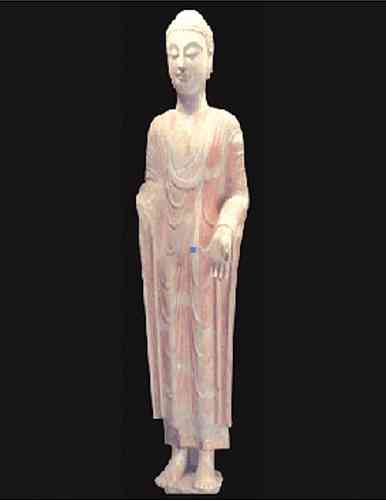 在东魏至北齐这段历史中,青州龙兴寺佛教造像在许多方面出现了显著变化。衣物质地轻薄贴体,衣褶纹理简洁质朴是其中突出的表现。北齐出土的许多贴金彩绘石雕像立佛,便是典型的“曹衣出水”风格的佛像,充分地体现了服饰轻薄紧窄的特点。这尊佛像胸部平坦,小腹微微隆起,在佛像袈裟上找不到任何繁杂的雕刻或是色彩斑斓的衣纹,只有简单的线条点缀在服饰的边缘,以此展现出着衣的痕迹。袈裟薄而紧贴身体,充分彰显了佛像身体轮廓的线条美,给人以“体态健康优美”的视觉感。这种造像服饰风格与同时期的画家曹仲达的佛像绘画风格十分相像——人物衣衫紧贴身体,宛若从水中捞出来一般,是“曹衣出水”式造型风格的典型代表。 (下转二版) (谢渊)