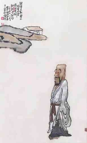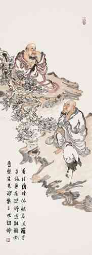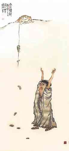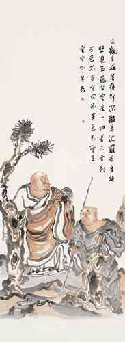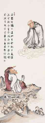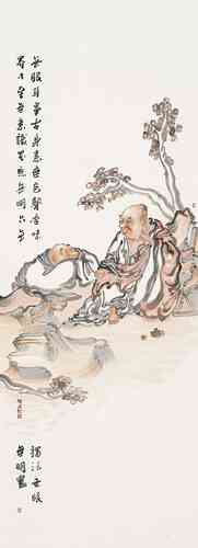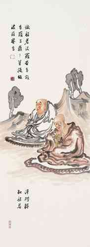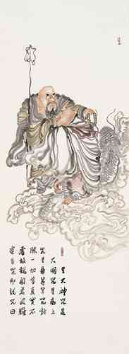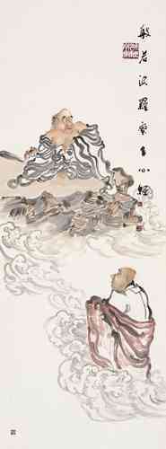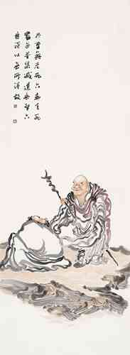 演旭法师所画的罗汉,颇具趣味,人物额的变型恰到好处,敷色淡雅中透着一种清新的韵味。谈到人物画的“变型”这并不是一件很容易的事。记得年轻求学时,吾师卢沉卢炳炎先生在授课时告诉我们这些学生,画人物要注意画出人的“意”象。亦即“内在精神”,未达到突出“精神”二字,不妨有些“变型”的操作,这种“变型”其实对我们这些画惯了写实的学生来说却是个难题,尤其是科班出身,几年来都循守着忠于对象的描绘,丢掉造型严紧准确的技能而去“变型”,用此“变型”去突出“意”象,真是一件痛苦而难办的事。我想演旭法师的罗汉变型那样自然生动,可能得益于他自己所说的:“早年画过很多漫画……”然而他现在所绘制的佛教罗汉内容的作品又超脱了漫画的层次。