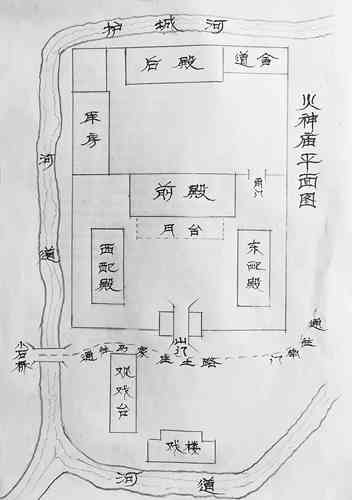 据当地老人回忆,火神庙系一处规模较大的道教庙宇,占地约10市亩,南北坐向,前后两院,院前有戏楼,建筑考究,风格独特。院内古柏苍劲,杨树参天。南、北、西三面环涧,环境优雅。庙内主祭火神爷、龙王爷,香火旺盛,庙貌焕然。山门坐北面南,入山门,迎面有主殿三楹,殿前0.5米高的露台,台下有康、乾、道及民国时期不同年代的重修庙碑数通。左右各有东西配殿三楹,皆青砖灰瓦建筑。正殿前有3米深的卷棚,卷棚两硬山各开一拱形小门。进卷棚,首先映入眼帘的是两根朱红柱子上的一副抱柱对联,惜年久难忆其内容。步入大殿迎面有1米多高的神台,台上有近3米高的木制神龛,神龛制作精雕细饰,内塑火神爷坐像,像高2米有余,赤发赤须,貌凶猛,侧立侍者皆威武,尚不知其为谁。火神爷身有四臂,上两臂举过头顶,一手托着太阳,一手托着月亮。下两臂在胸前一手执铜铃,一手执宝剑,相貌威严,令人生畏。火神爷塑像前神龛外,还有一尊小型火神爷像。此像高1米余,为木雕像,雕工精细。据说,此像专为火神爷过生日(古历六月二十三)唱大戏时,将像抬到观戏楼上看戏专用,平时便置于大像前一并供奉。正殿为单檐硬山式建筑,青砖绿瓦花格门窗,脊饰吻兽别具一格。