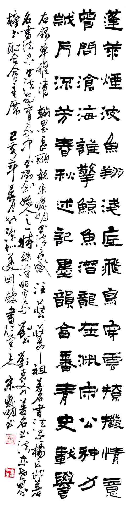 宋爱明先生认识到:书法作为艺术,在撇捺点画之间,可洞见大海的博大胸怀,大山的伟岸巍峨。在提按之中时有寒食之叹,又有兰庭之叙。娓娓道来有顿挫,一波三折有传说。呐喊,如剑出锋,静默,藏而不语。四声有韵,余音绕梁,就是那廖廖几笔,或许你就听到了远年的呼唤。