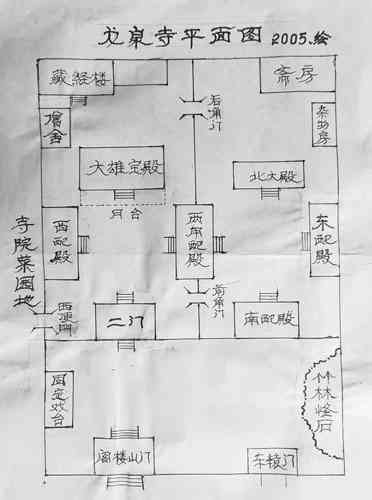 据有关资料证实,龙泉寺的建筑,以南北为轴线,共由三进院落和一个东跨院组成。山门坐北面南,是一座二层阁楼式建筑。底层拱券式门洞,进深5米。二层为一砖木式结构的钟楼,上悬大铜钟一口,高约1.60米,口径近1米,钟声悠扬、声震乡野。据老人回忆钟上的铭文有嘉庆纪年,1949年前此钟便不知去向。进山门至二门前为一广阔地带,因该寺庙田很多,故农忙季节在此当做场园用。西首坐西面东原有戏楼,后只剩一个光腚子戏台,农闲时偶有法事活动,场园便当做戏场唱大戏。场地的东首是一片茂密的竹林,竹林中置几块一人多高的怪石,为寺院增添一些清幽之气。竹林的南侧,山门正东20多米处有一个大辕门,平时很少开,仅在收割庄稼时,开此大门便于车辆出入。