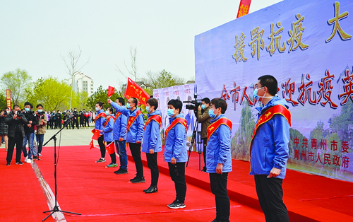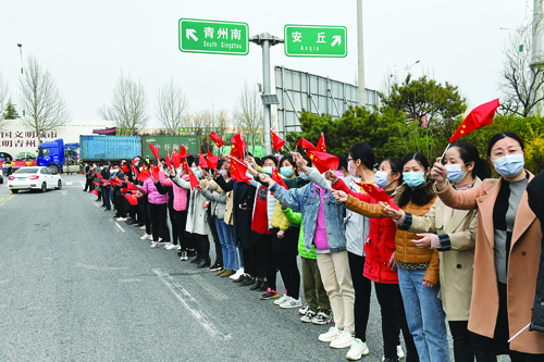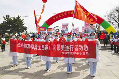 4月1日、5日我市两批援鄂医疗队共11名队员分别平安回家! 警车开道,铁骑护卫,家乡人民以最高礼仪迎接英雄回家。 在东夷文化标志园,我市两次举行隆重的欢迎仪式,迎接英雄凯旋。 悬壶入荆楚, 白衣做战袍。 春天如期至, 英雄平安归。 我们会牢牢记住 你的名你的脸 幸得有你 山河无恙 我们的英雄 向你们致敬! 凯旋的英雄名单:潍坊市益都中心医院的庄育田、钟安桥、王婷、王从政、赵雪、单正坤、王娜;青州市人民医院的郭红霞、鞠晓霞、程军伟、赵振芹。 记者曹健强摄