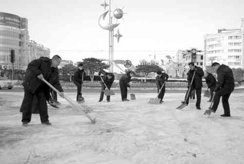 2012年12月30日,青州市干部群众自发到城区主要干道破冰除雪。近日,连续大雪及低温天气使青州市的道路积雪、积冰现象严重,直接影响市民的出行安全,干部群众利用周末休息时间自发的上街道清扫积雪、残冰,确保市民雪后能安全行走和行车。图①为教师们在驼山路上清理积雪。图②为12月31日中午,孩子们放学路上没有积雪了。 记者曹健强 通讯员曹希莹 赵海军摄