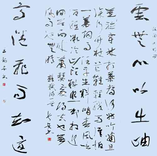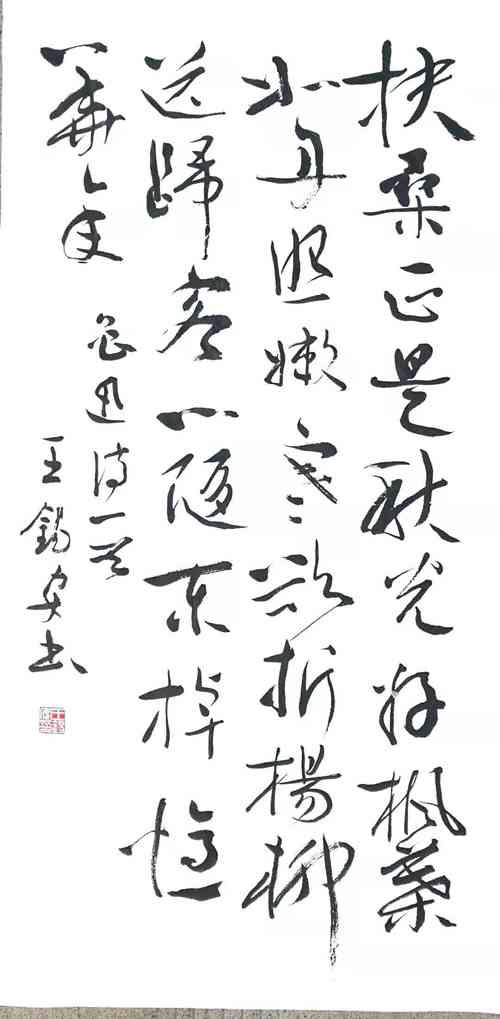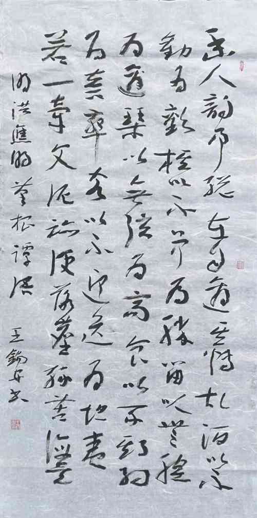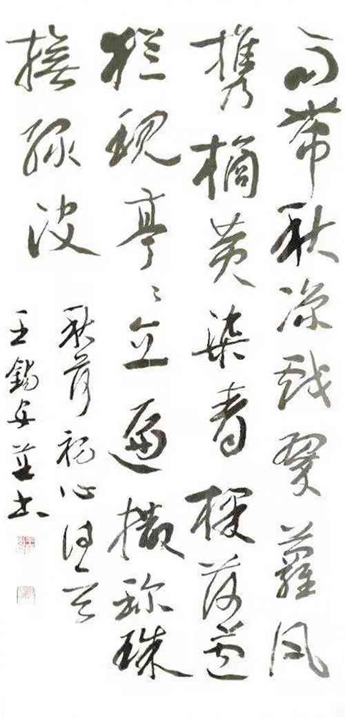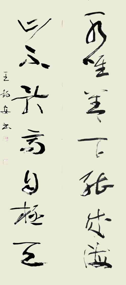 因为“朴”、“清”对王锡安先生的笔墨来说,是一次新的提升,在用笔上进一步越出今草的“控制”,进入更加自由的境界。这时的作品起笔轻松自然,行笔干净清和,中锋保持游刃有余。更加注重线条本身的力度呈现,同时充分利用飞白,出锋效果,注重点线的变化,线条洗练劲健,沉着有力,如深山老松。还有断笔增多,异于早期的连绵手法,笔画断而后起,笔断意连而痛快。渴墨干笔画亦透出苍劲不失华滋的墨韵,飞白则出现新的运动及节奏运律的美感。在结构上王锡安先生追求古厚、宽博,清和之境,注重文化味儿。在章法上强调字的大小、虚实、奇正的墨融效果,力避均衡板滞,富于节奏的音乐旋律,追求一种古典的清和美,他不以唐法入草,和那些在行草后加个尾巴写“章草”的有别,这是他审美趣味对书法的渗透,是典型的学者、文人书法。